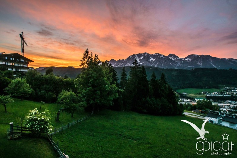 Es wird Abend über Rohrmoos und Untertal - im Hintergrund das Dachsteinmassiv.